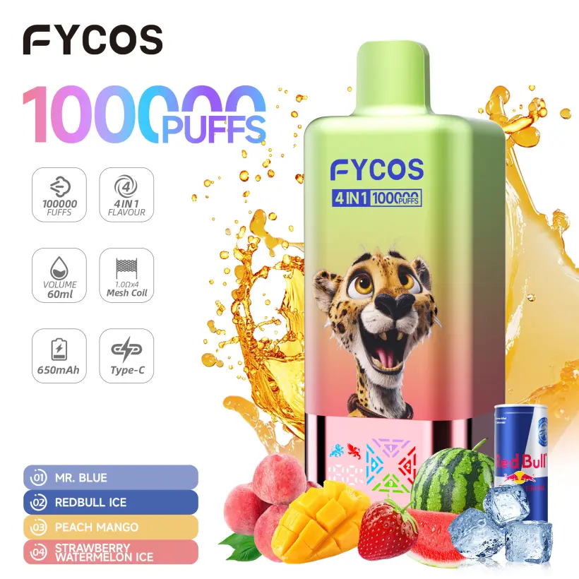FYCOS 100K Puffs 4-in-1 Disposable Vape offers ultra-long use with 100,000 puffs, a reliable 650mAh battery, and a generous 60ml e-liquid capacity. Its 0.9Ω dual mesh coil delivers smooth, rich vapor, while Type-C charging ensures fast and efficient power. With 10 great flavors and free shipping, it’s perfect for both personal vaping and wholesale orders.